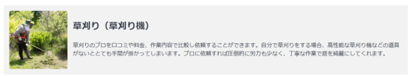 ハウスクリーニングやリフォーム業者など、自宅の大掛かりな改装・清掃の際に活躍する業者は、草刈りにもぴったり!